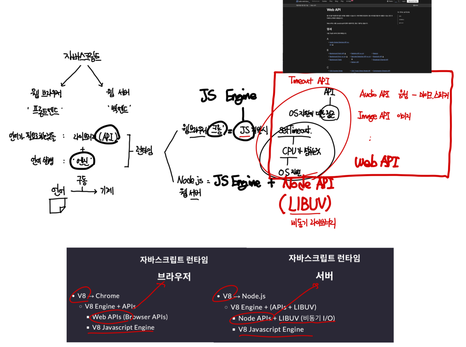 - JS Engine + Web API: μΉ λΈλΌμ°μ μμλ μλ°μ€ν¬λ¦½νΈ μμ§κ³Ό Web APIκ° κ²°ν©λμ΄ μλ°μ€ν¬λ¦½νΈ μ½λλ₯Ό μ€ννλ€. Web APIλ DOM μ‘°μ, νμ΄λ¨Έ μ€μ , HTTP μμ² λ± λΈλΌμ°μ νκ²½μμ μμ£Ό μ¬μ©νλ κΈ°λ₯λ€μ μ 곡νλ€.
