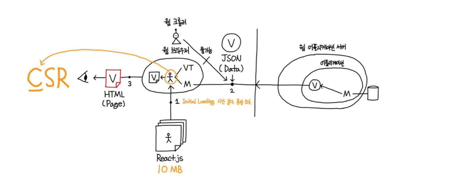 - CSR: ν΄λΌμ΄μΈνΈ μΈ‘μμ μλ°μ€ν¬λ¦½νΈλ₯Ό λ‘λν΄, μ¬μ©μμμ μΈν°λμ μ μ²λ¦¬νλ€.