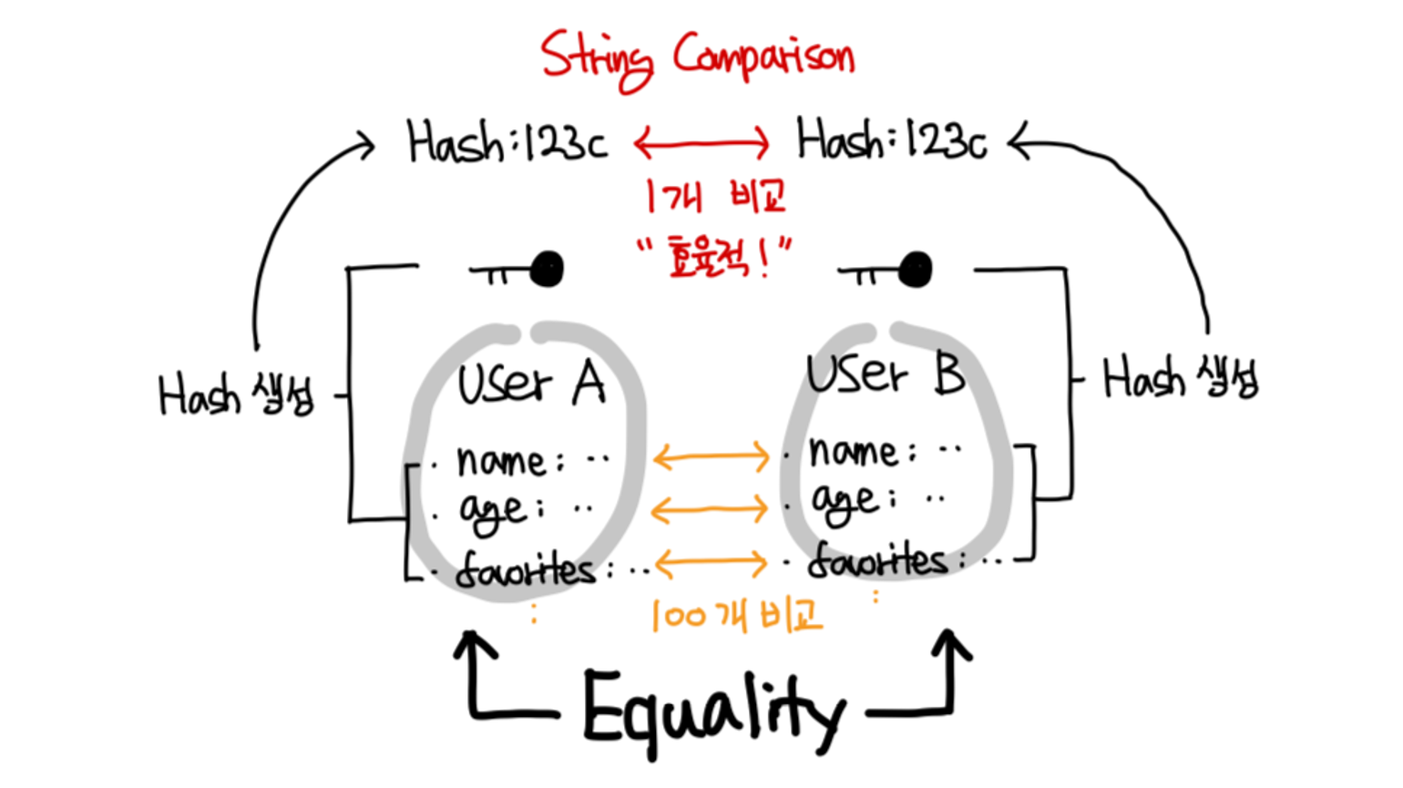 Hashλ κ°μ²΄μ κ³ μ μ±μ λνλ΄λ κ°μ΄λ€. λ κ°μ²΄κ° λμΌνμ§ λΉκ΅νλ €λ©΄ λͺ¨λ νλλ₯Ό λ€ λΉκ΅ν΄μΌ νμ§λ§, ν΄μκ°μ μμ±ν΄μ λΉκ΅νλ©΄ λλ€.