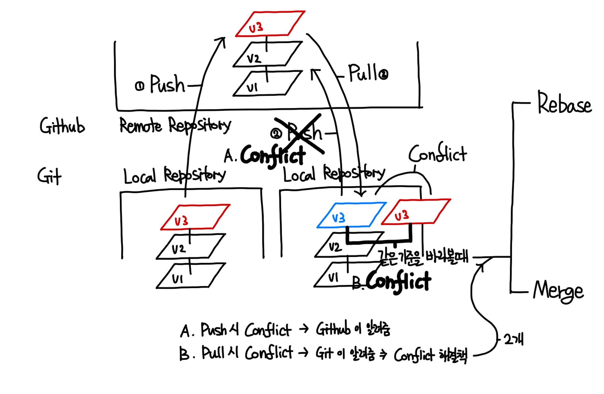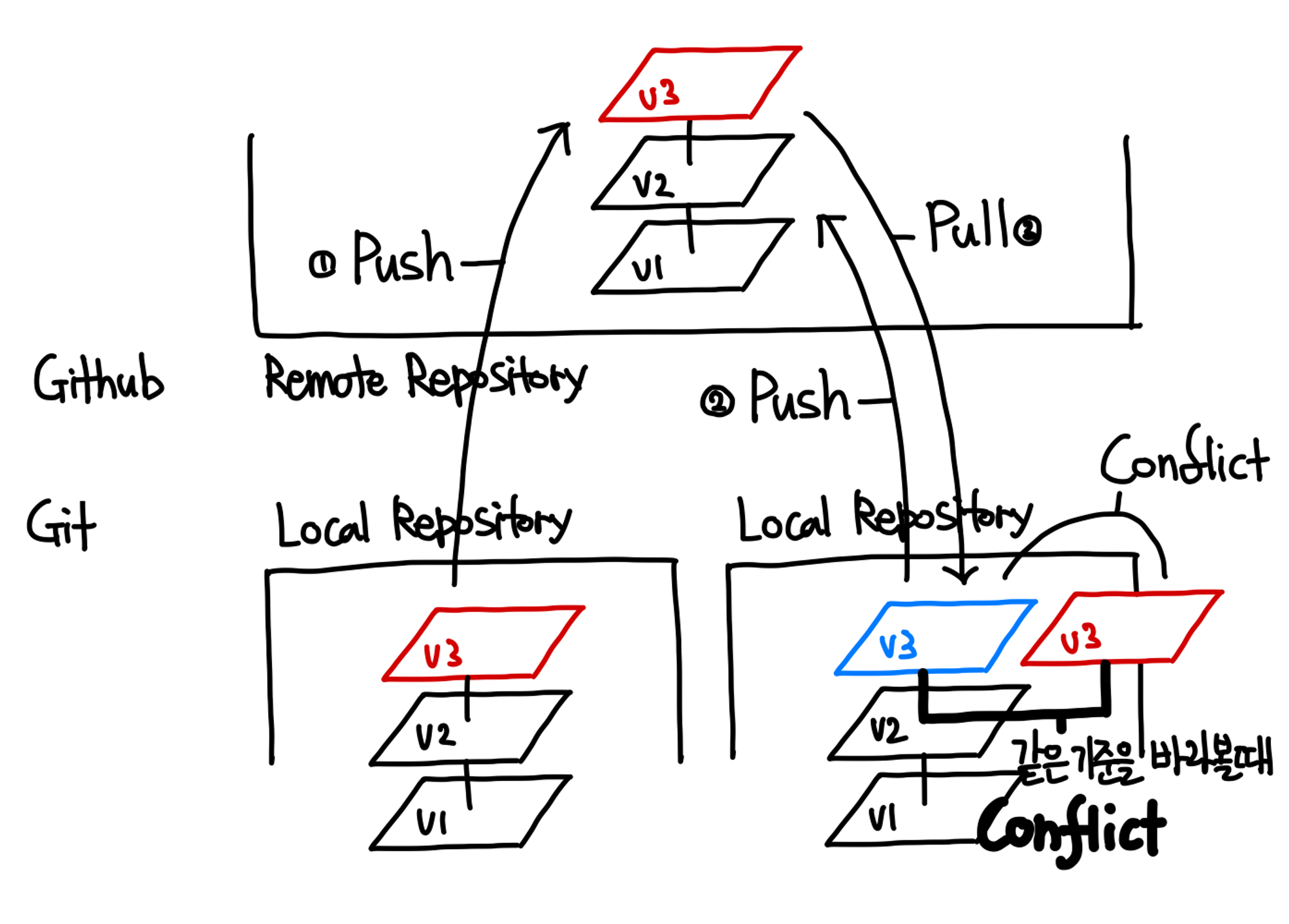`git push`๋ฅผ ์คํํ ๋ ์ถฉ๋ ๋ฐ์. (GitHub๊ฐ ์๋ ค์ค) V3์ V3 ๋ชจ๋ V2๋ผ๋ ๊ฐ์ ๊ธฐ์ค ์์ ์์ ์ํ