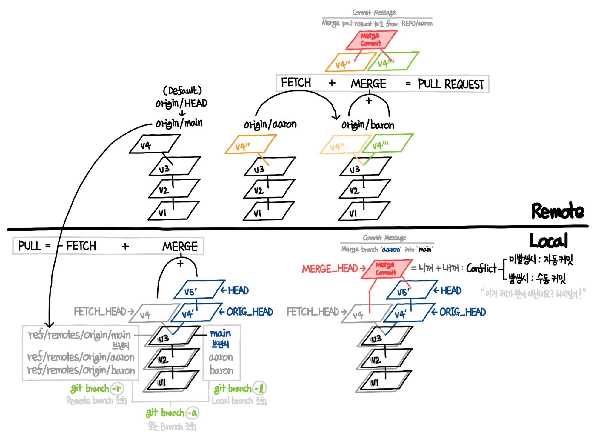 - Merge: ๊ฐ์ ธ์จ ์๊ฒฉ๋ธ๋์น์ ์ต์ ์ฝ๋๋ฅผ ๋ก์ปฌ ๋ธ๋์น์ ํ์ฌ ์ฝ๋์ ๋ณํฉํ๋ ์์