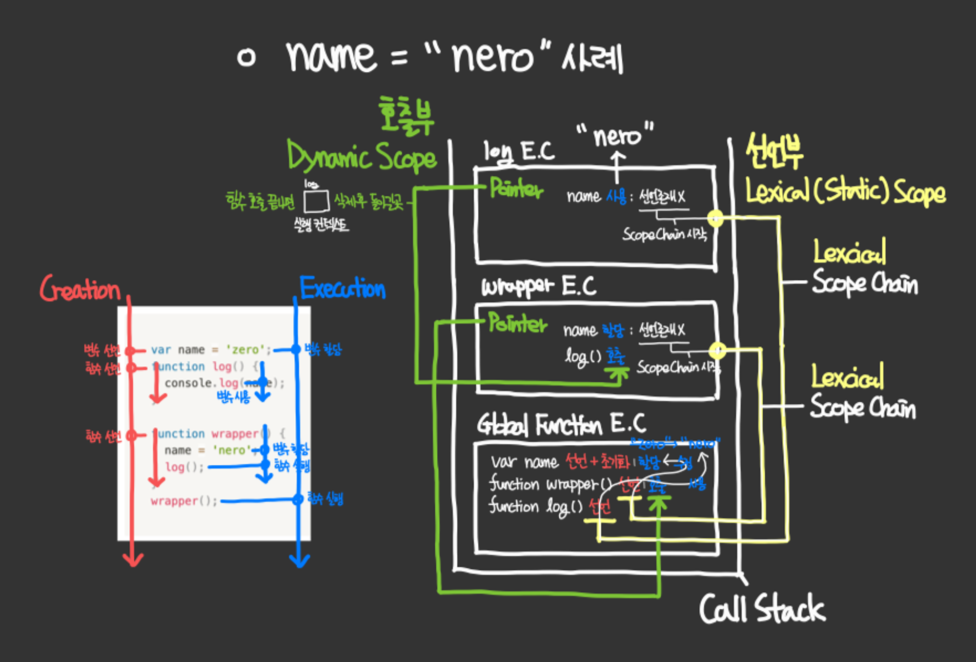 - `log()`๊ฐ ์คํ๋ ๋, ์ ์ญ ๋ณ์ `name`์ ์ฝ์ด์ ์ฝ์์ `'nero'`๋ฅผ ์ถ๋ ฅํ๋ค.
