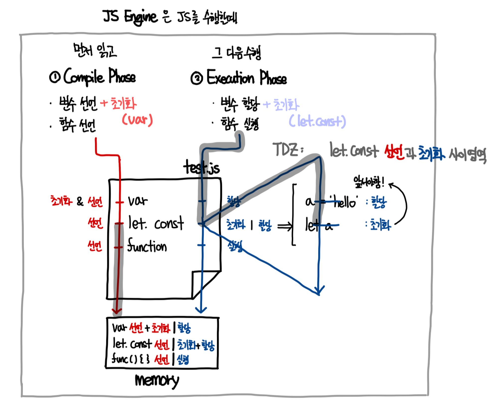 ์๋ฐ์คํฌ๋ฆฝํธ ์์ง์ ํ์ผ์ ์คํํ๊ธฐ ์ , ๋จผ์ ์ฝ๋์ ๋ฑ์ฅํ๋ ๋ชจ๋ ๋ณ์์ ํจ์ ์ ์ธ์ ๋ถ์ํ์ฌ ๋ฉ๋ชจ๋ฆฌ์ ์ ์ฌํ๋ค.