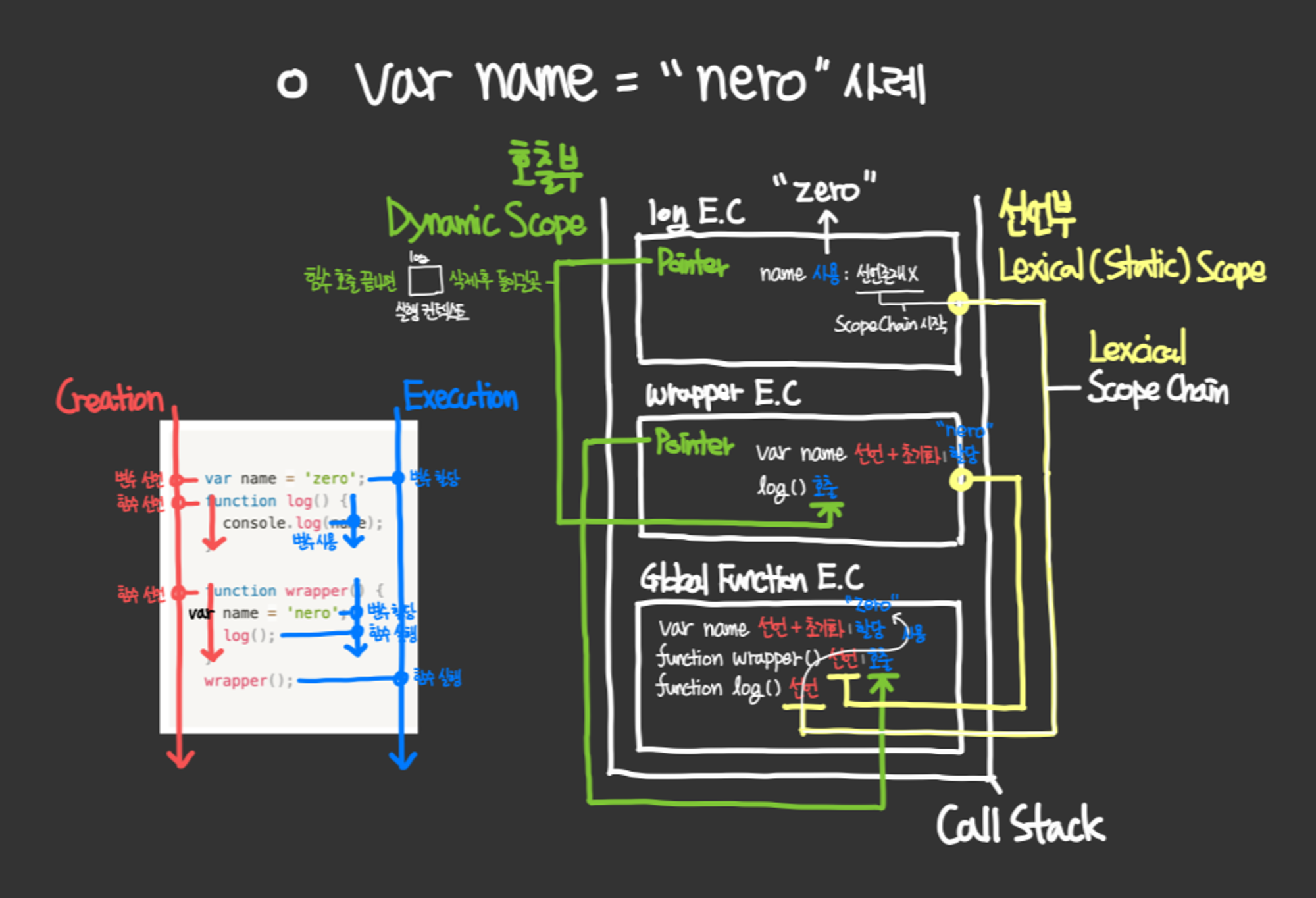 - `var name = 'zero';` ์ ์ญ๋ณ์ `name`์ `'zero'`๊ฐ ํ ๋น๋๋ค.