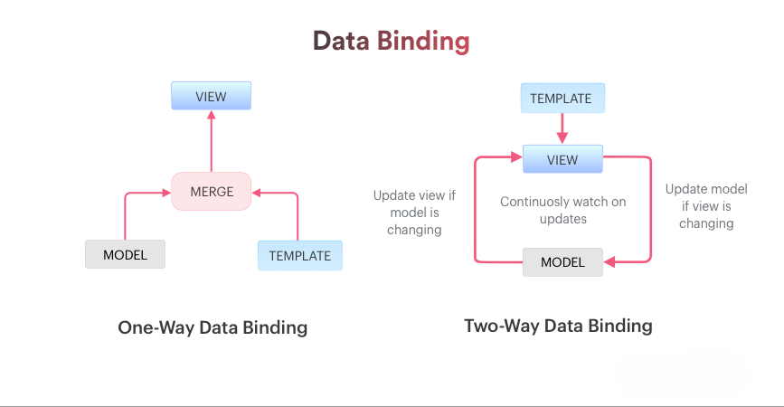 ๋ฐ์ธ๋ฉ์ View(ํ๋ฉด)์ Model(๋ธ๋ผ์ฐ์ ๋ฉ๋ชจ๋ฆฌ์ ๋ฐ์ดํฐ)๋ฅผ ์ผ์น์ํค๋ ์์ ์ด๋ค. ์ฆ, ๋ฐ์ดํฐ๊ฐ ๋ณ๊ฒฝ๋๋ฉด ํ๋ฉด์ ๊ทธ ๋ฐ์ดํฐ๊ฐ ๋ฐ์๋๋๋ก ํ๊ณ , ํ๋ฉด์ด ์ ๋ฐ์ดํธ๋ ๋๋ง๋ค ์ํ๊ฐ ๋ณ๊ฒฝ๋๋๋ก ๋๊ธฐํํ๋ ๊ณผ์ ์ ์๋ฏธํ๋ค.