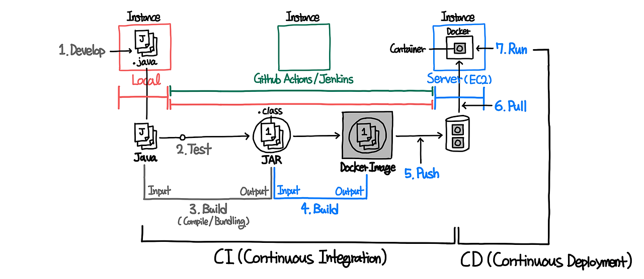 - CI ์ ์ฐจ: 1. Develop → 2. Test Java → 3. Build Java → 4. Build Docker Image → 5. Push