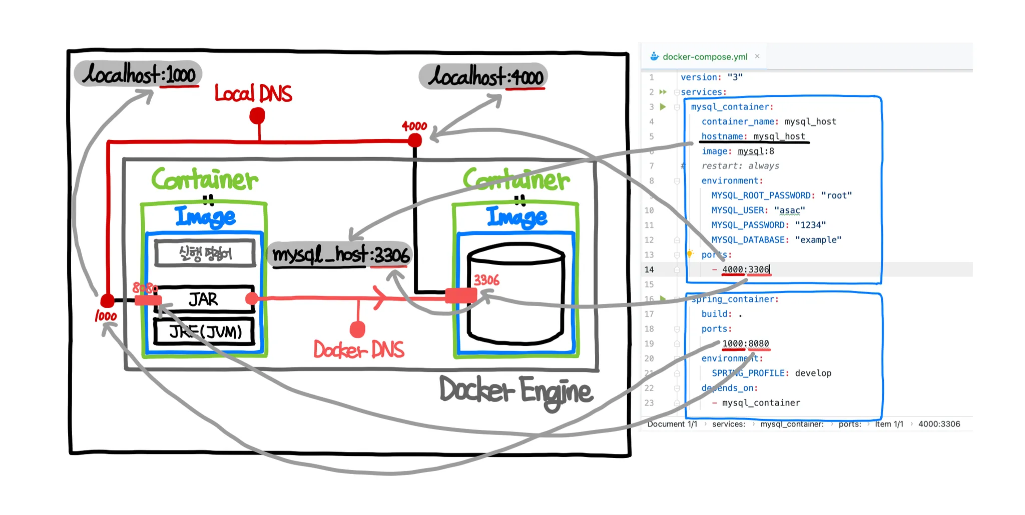 - `services`: mysql_container_service์ spring_container_service ๋ ๊ฐ์ง ์๋น์ค๋ฅผ ์ ์ → ๋จ์ ์ต์ ๊ตฌ๋ถ