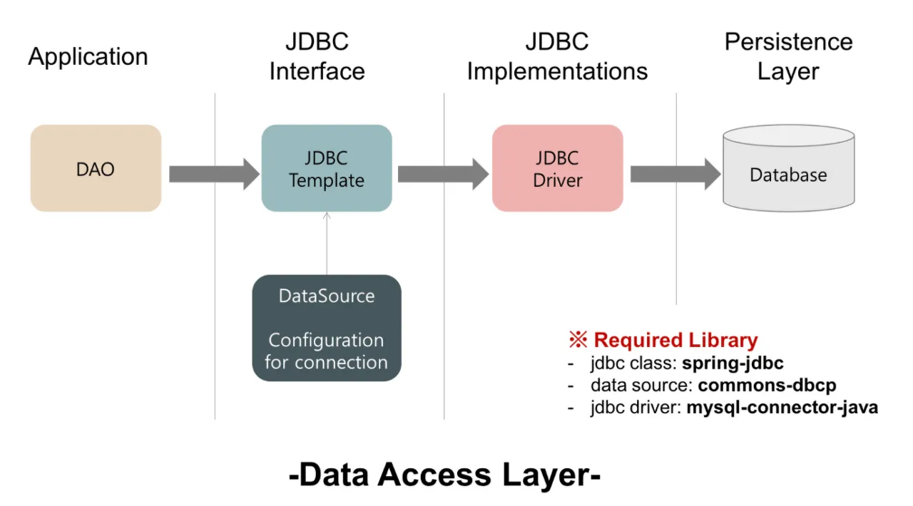 - Connection 생성, 자원 반환, SQLException 처리 등 반복 작업이 필요 없음.