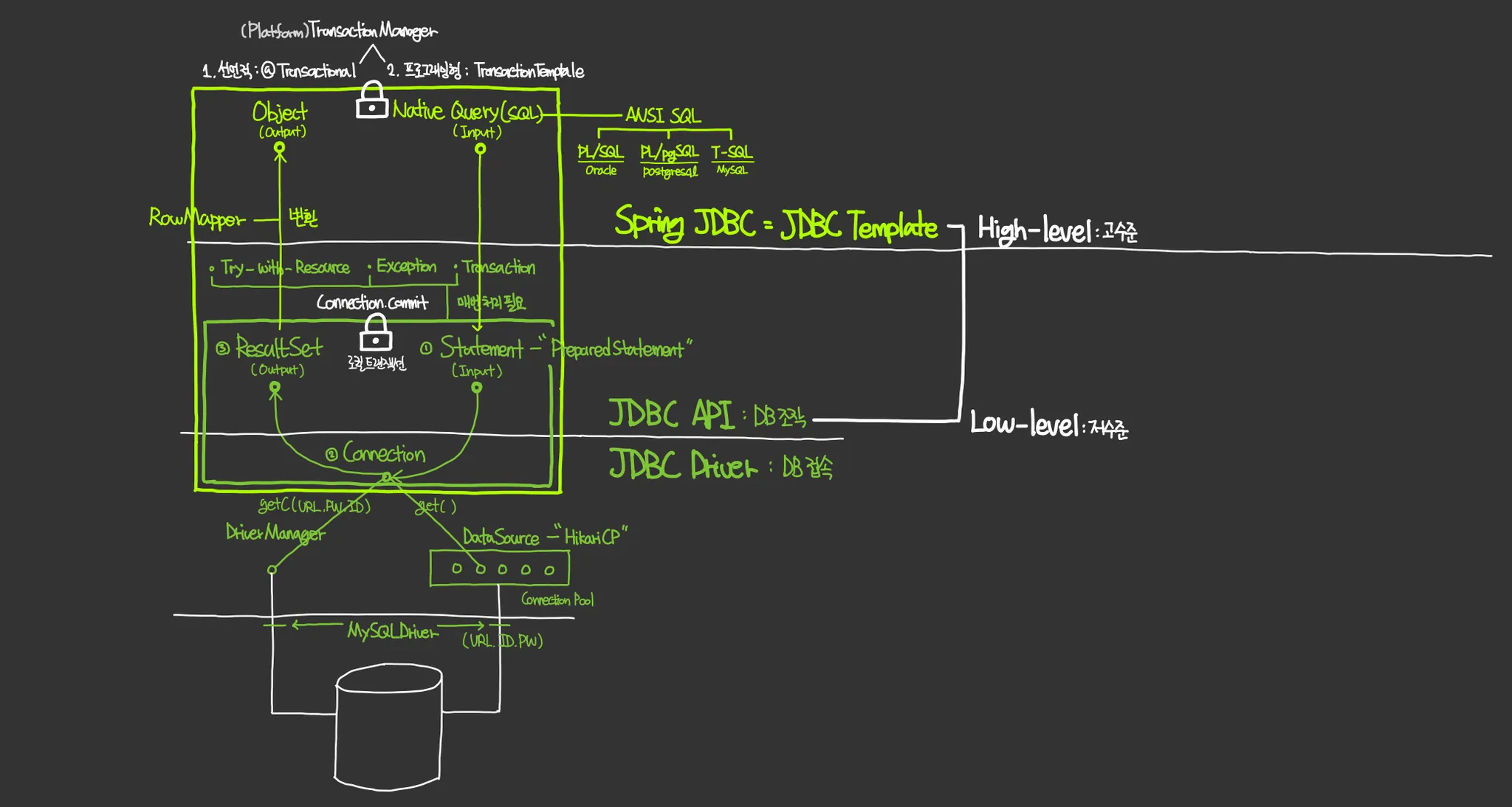 JdbcTemplate은 이 모든 과정을 내부적으로 처리하여 간단하고 깔끔한 코드를 작성할 수 있도록 도와준다.