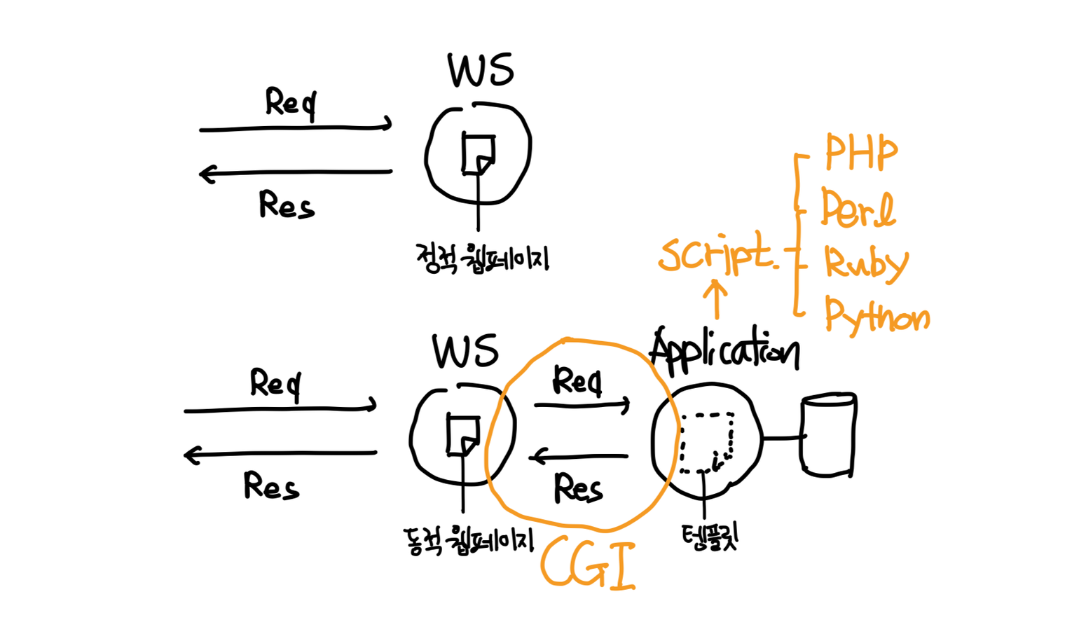 μ΄κΈ°μλ μΉ μλ²κ° ν΄λΌμ΄μΈνΈμ μμ²μ λ°μΌλ©΄, μ΄ν리μΌμ΄μ μκ² λμ μΉ νμ΄μ§ μμ± μμ μ μμνλ€. μ΄λ, μΉ μλ²μ μ΄ν리μΌμ΄μ μ μ°κ²°νλ κΈ°μ μ΄ CGI (Common Gateway Interface)λ€.